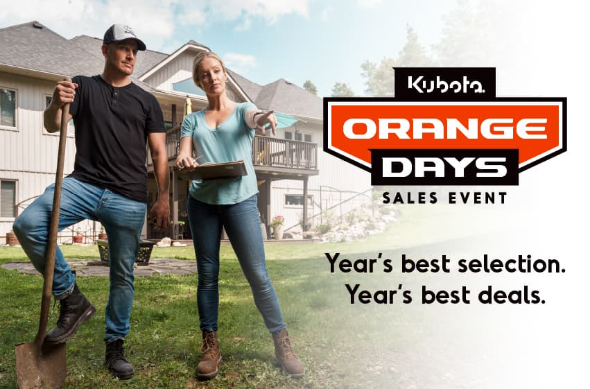 *Coupon is valid on the purchase of a new Kubota F, GR, T, Z, RTV, BX, B (excluding B26), LX, Std L (excluding L47), Grand L, MX Series. Coupon is only valid for the individual registered at the participating Kubota Orange Days event dealership attended. Coupon is nontransferable. Only one coupon per customer. No cash value. Coupon must be presented at time of purchase.Coupon expires 60 days post dealer event.